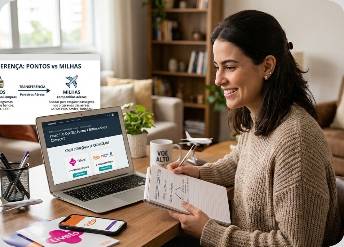 Você vai conhecer os principais aplicativos e programas de milhas, entender como usá-los no dia a dia e começar a juntar pontos de forma simples, sem gastar mais por isso.